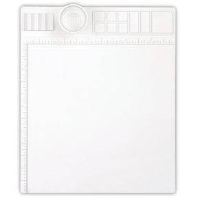 Non-stick, waterproof, and heat-resistant multi-function craft mat. Recessed work area measuring approximately 12x12 inches. Features built in brush holders, a collapsible water cup with cleaning ridges, and multiple sized reservoirs. Perfect for painting, clay modeling, epoxy resin projects, and more! Imported.